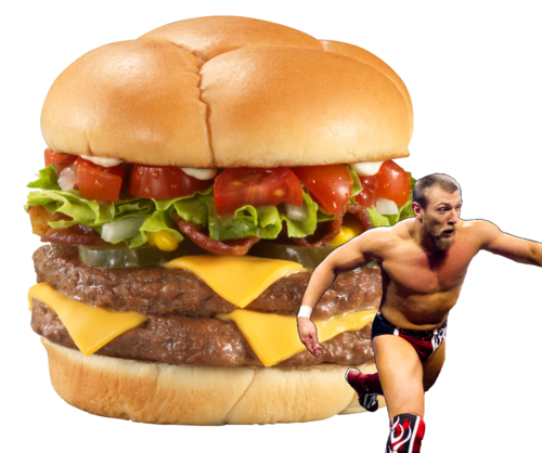 Whether you watch professional wrestling or not, the image of a grown man with a full beard and glorified leather underwear running away from a burger is pretty entertaining in itself.