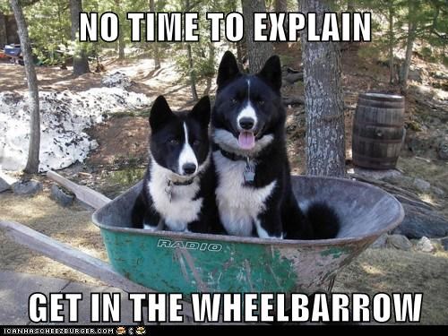NO TIME TO EXPLAIN! GET IN THE WHEELBARROW!