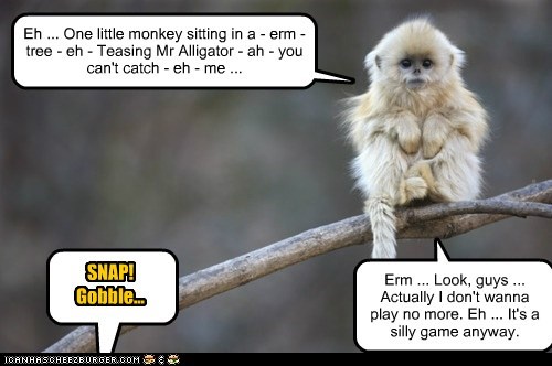 "Eh... One little monkey sitting in a -- erm -- tree -- eh -- teasing Mr. Alligator -- ah -- you can't catch -- eh -- me..." SNAP! Gobble... "Erm... look, guys... actually I don't wanna play no more. Eh... it's a silly game anyway."
