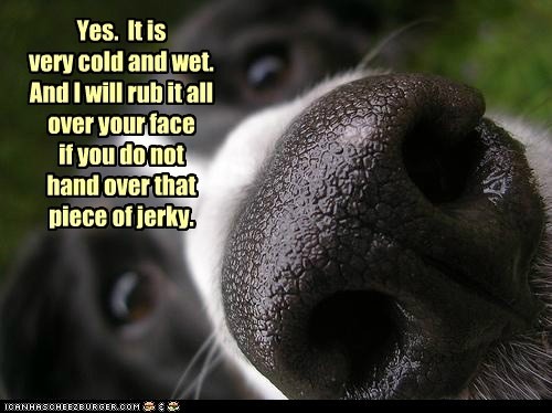 Yes. It is very cold and wet. And I will rub it all over your face if you do not hand over that piece of jerky.