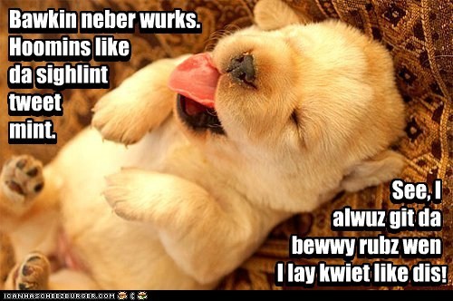 Bawkin neber wurks. Hoomins like da sighlint tweetmint. See, I alwuz git da bewwy rubz wen I lay kwiet like dis!