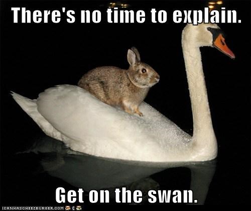 There's no time to explain. Get on the swan.