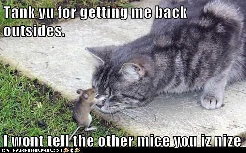 Tank yu for getting me back outsides. I wont tell the other mice you iz nize