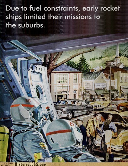 Due to fuel constraints, early rocket ships limited their missions to the suburbs.