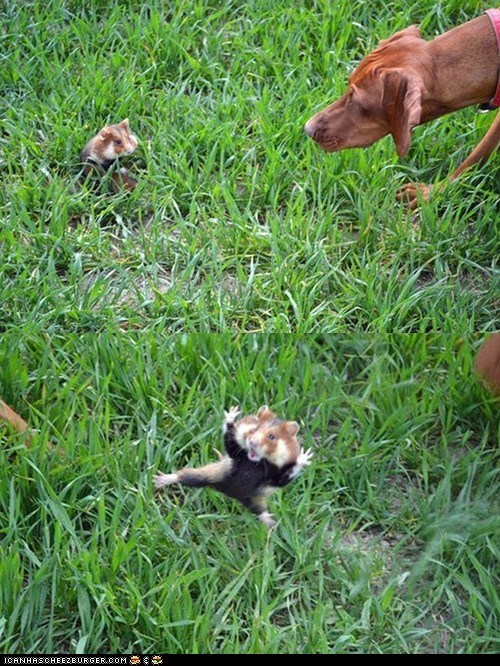 HIIIIII-YA! This adorable little hamster put his kung fu skills to use on a couple of curious Hungarian pointer dogs in Hradok, Slovakia. The dogs wanted to play with the hamster, but he became scared and started attacking. And with such fluid skill, too!