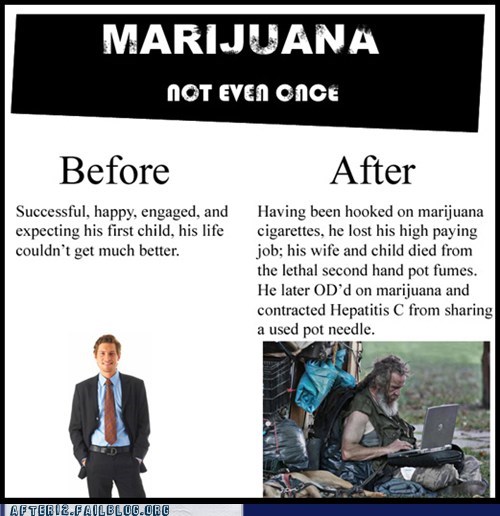 "I used to be a loving, wealthy family man with a beautiful wife, two kids, and a dog. We had a nice house with a bright picket fence out front. Then, one of my co-workers told me about a drug called "marihuana." I was instantly hooked. Pretty soon, all I cared about was smoking pot cigarettes. Eventually, I started snorting it. Then I injected it. Ten years later, and I'm just a tortured shell of man." - Anonymous submission we received concerning the dangers of marijuana.