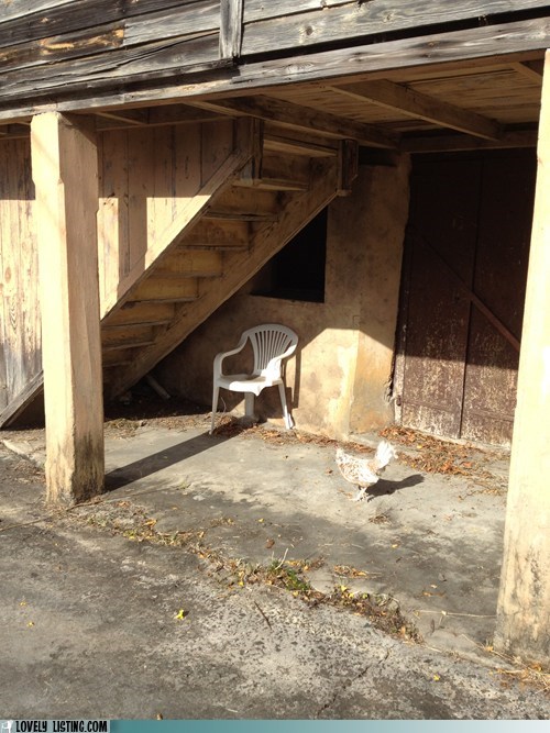It's nice of you to visit chair now that he's been banished to under the stairs, chicken. Now come back inside, we need to start cooking you.