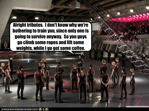 Alright tributes. I don't know why we're bothering to train you, since only one is going to survive anyway. So you guys go climb some ropes and lift some weights, while I go get some coffee.