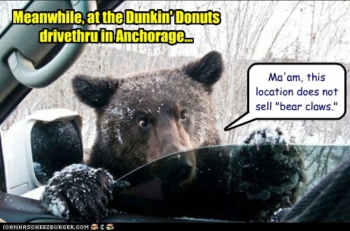 Meanwhile, at the Dunkin' Donuts drive-thru in Anchorage... "Ma'am, this location does not sell 'bear claws.'"