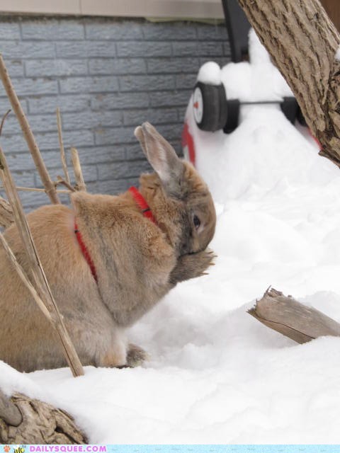 Vikki says: "This is my bunny Rambo washing his face, or perhaps praying for more snow."