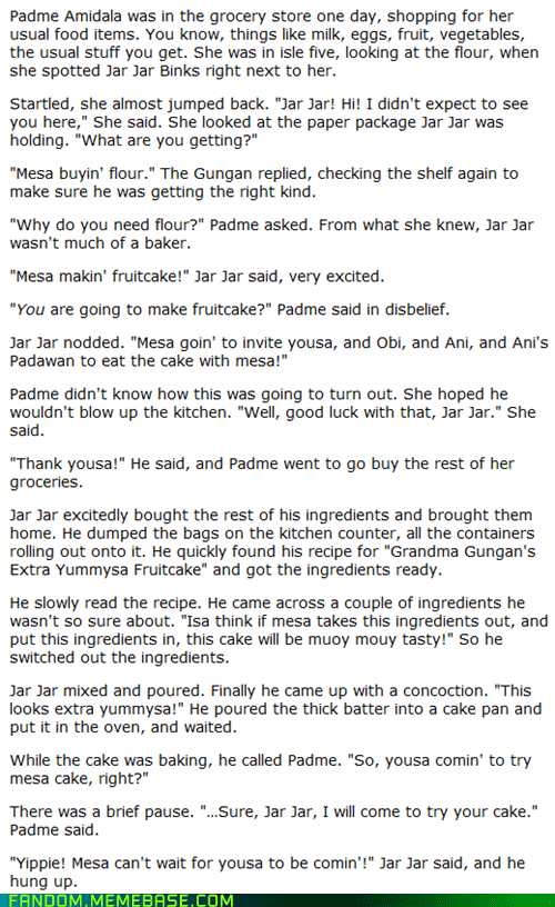May the fourth be with you, Fandom! I know what you're thinking; "fruitcake" must be code for something, this has got to be going down a weird and horrible path I can't follow (+10 internets if you see what I did there). Unfortunately, this story is just as advertised: Jar Jar Binks bakes a fruitcake and it's extra yummysa, even to Anakin, who is normally not a fan of fruitcake. Sadly, there's no recipe for "Grandma Gungan's Extra Yummysa Fruitcake," but there is a link to the full story in the Via below.