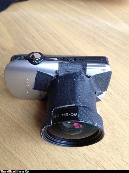 1) Take point 'n' shoot camera 2) Apply wide-angle lens 3) Secure with toilet paper tube and tape 4) ???? 5) PROFIT!!!!