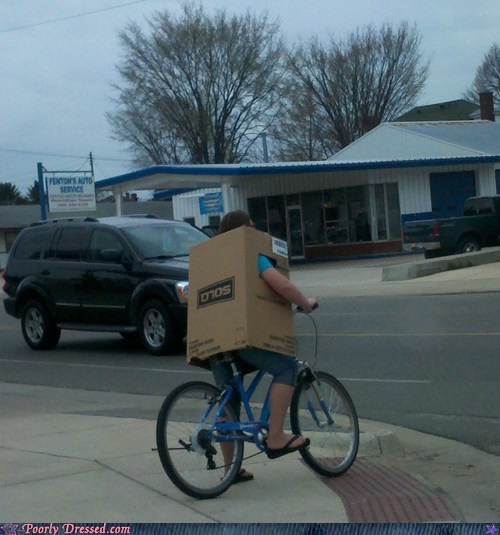 Unless he was going for some super-sweet box cosplay, I think he failed to dress for the weather.