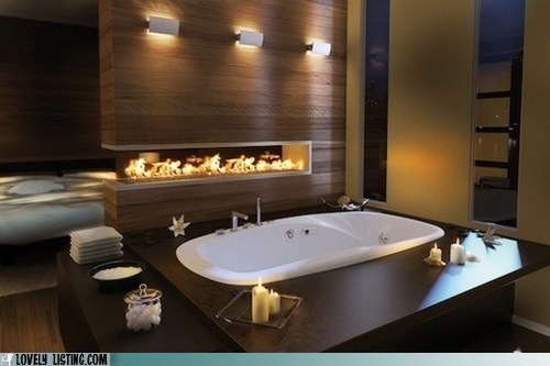 I fail to see the purpose of a fireplace in the bathroom. The whole fire/water thing just doesn't make sense to me.