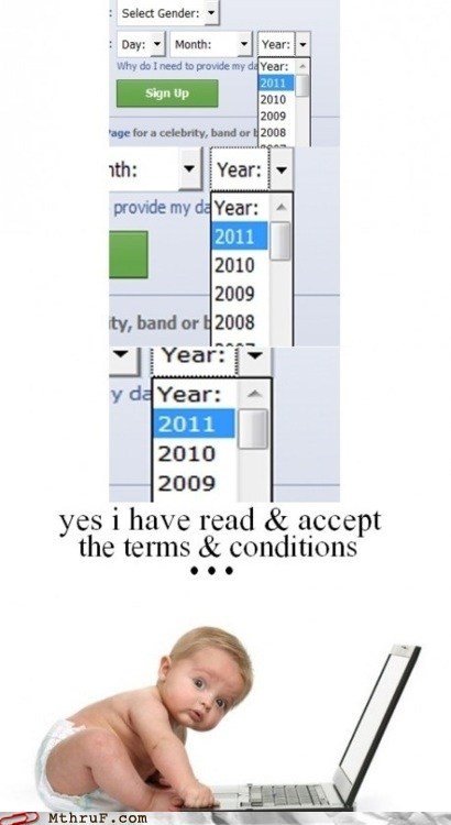 She's the only one out of all of us who reads the terms and conditions and she can't even read yet! We suck...