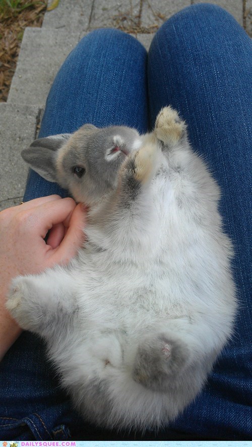 remembersarah says: "This is my miracle bunny, Nubs. I placed him on his back so it'd be easier to see why he is named in such a way. He is missing half of his hind legs, as well as his tail because his mother chewed them off the day after he was born. He was bleeding quite a bit, so I was afraid he wouldn't make it, but after plenty of special attention and prayer, Nubs miraculously survived. Now he is several months old, healthy, and his little nubs have healed nicely."