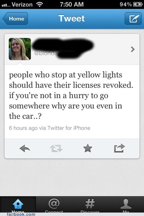 Meanwhile, the people who stop at yellow lights tweet "YOU DAMN KIDS GET OFF MY LAWN!"