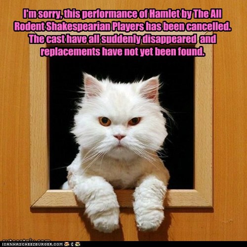 I'm sorry, this performance of Hamlet by the All Rodent Shakespearian Players has been cancelled. The cast have all suddenly disappeared and replacements have not yet been found.