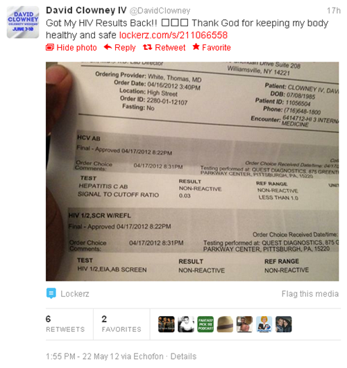 Buffalo Bills wide receiver David Clowney was so excited that his recent HIV test came back negative, he decided to share his good news with the Internets. Touchdown!