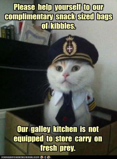 Please help yourself to our complimentary snack sized bags of kibbles. Our galley kitchen is not equipped to store carry-on fresh prey.
