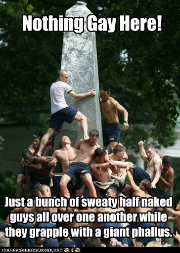 Nothing Gay Here! Just a bunch of sweaty half naked guys all over one another while they grapple with a giant phallus.