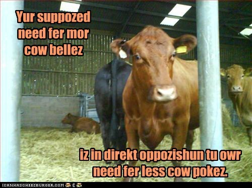 Yur suppozed need fer mor cow bellez iz in direkt oppozishun tu owr need fer less cow pokez.