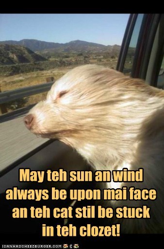 May teh sun an wind always be upon mai face an teh cat still be stuck in teh clozet!