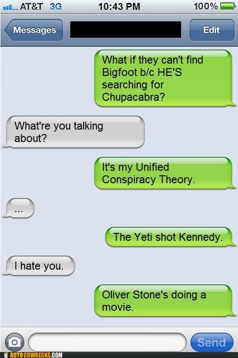 I eagerly await the Oliver Stone conspiracy epic featuring Loch Ness, Bigfoot, the Yeti, the Roswell aliens, Bloody Mary, and Flava Flav (because let's be honest, he's been a figment of our collective imagination the whole time).