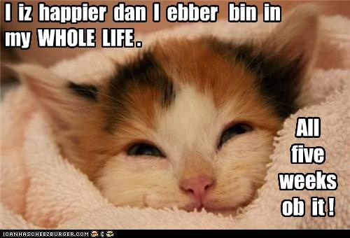 I iz happier dan I ebber bin in my WHOLE LIFE . All five weeks ob it!