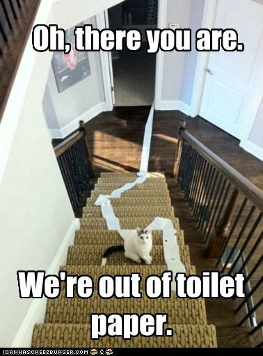 Oh, there you are. We're out of toilet paper.