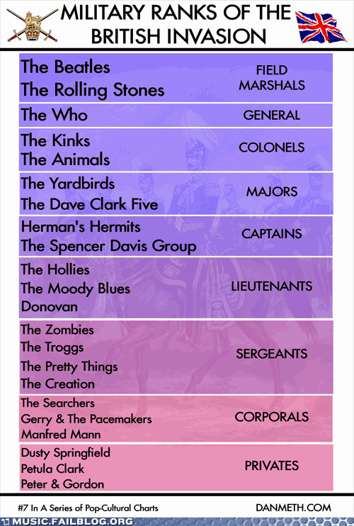 If the British Invasion was an actual invasion, the United States would be a recaptured colony by now. All they had was Perry Como and maybe the Beach Boys, but Brian Wilson was rumored to be a terrible fighter. The only hope for the U.S. would have been Motown.