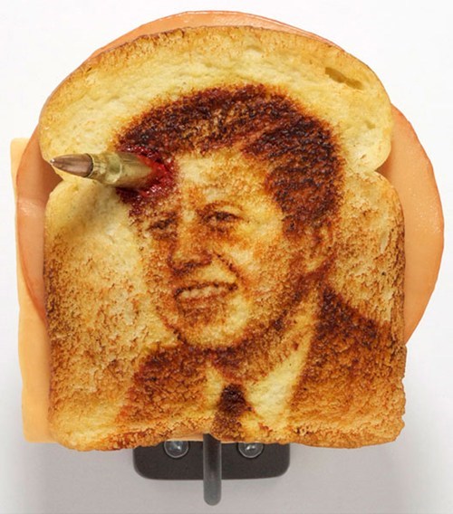 is known for his humorous wax sculptures. But this series deals in toast -- along with oil paint, beeswax, and other elements -- used to recreate memorable moments in history.