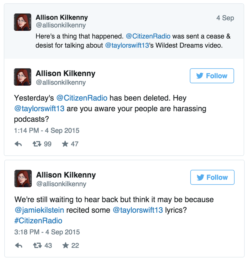 Swift's legal team has been going after innocuous fan accounts and podcasts for allegedly violating copyright laws, causing outrage amongst Taylor fans and haters alike. In the case of the Citizen Radio podcast, the cease and desist notice they received claimed Citizen Radio had played a Taylor Swift song in their podcast, but the podcasters claim they only recited lyrics. Another incident involved a Taylor Swift fan page having their tweets blocked based on copyright grounds: