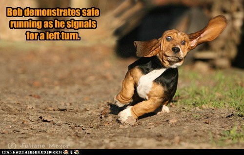 Bob demonstrates safe running as he signals for a left turn.