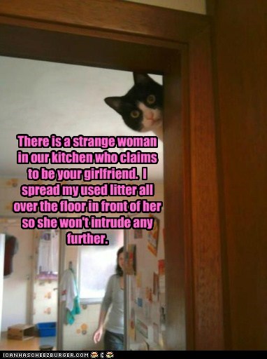 There is a strange woman in our kichen who claims to be your girlfriend. I spread my used litter all over the floor in front of her so she won't intrude any further.