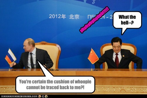 pbpbpbpbpbtttt! "What the hell-?" "You're certain the cushion of whoopie cannot be traced back to me?!" (Vladimir Putin)