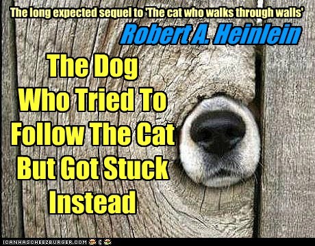 The long expected sequel to 'The cat who walks through walls'. Robert A. Heinlein "The Dog Who Tried to Follow The Cat But Got Stuck Instead"