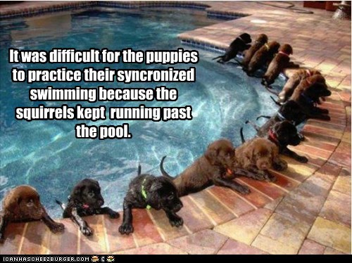 It was difficult for the puppies to practice their synchronized swimming because the squirrels kept running past the pool.