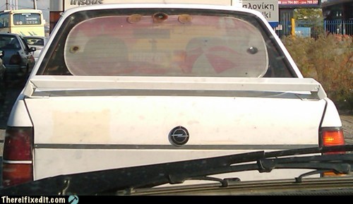 "Hand made rear spoiler, apparently made from a sheet of metal! Plus, it comes with a bonus item: the wobbling badge, fixed in place with a single screw..."