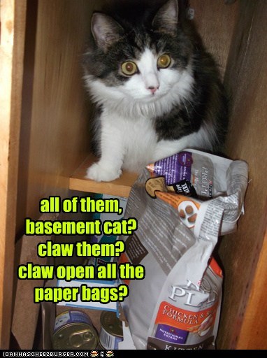 all of them, basement cat? claw them? claw open all the paper bags?