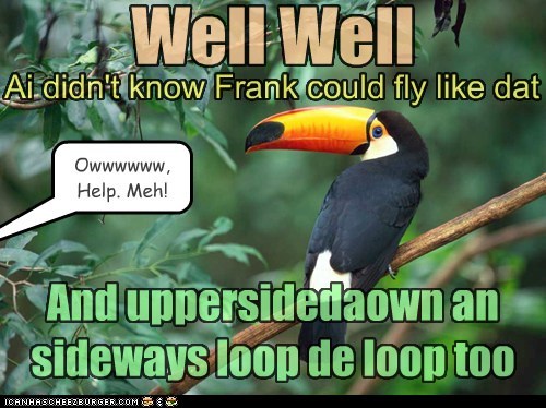 "Well well, Ai didn't know Frank could fly like dat." "Owwwwww, Help. Meh!" "And upsidedaown an sideways loop de loop too."