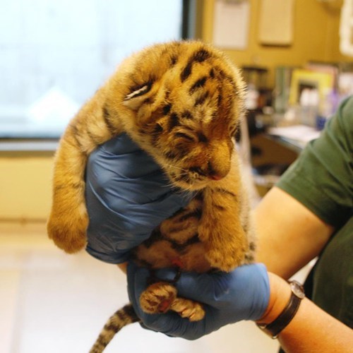 While the smaller of the two passed away (one-third don't survive the first 30 days of life), this little guy is being raised by handlers because mom wasn't displaying the quality of maternal care required to raise the cub.