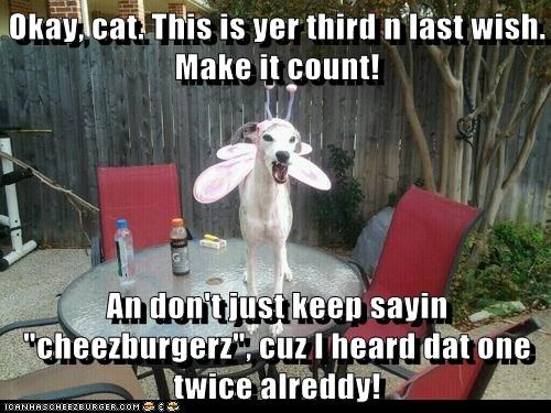Okay, cat. This is yer third n last wish. Make it count! An don't just keep sayin "cheezburgerz", cuz I heard dat one twice alreddy!