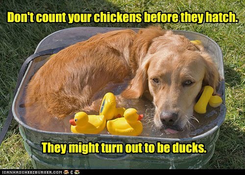 Don't count your chickens before they hatch. They might turn out to be ducks.