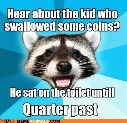 Hear about the kid who swallowed some coins? He sat on the toilet until quarter past.