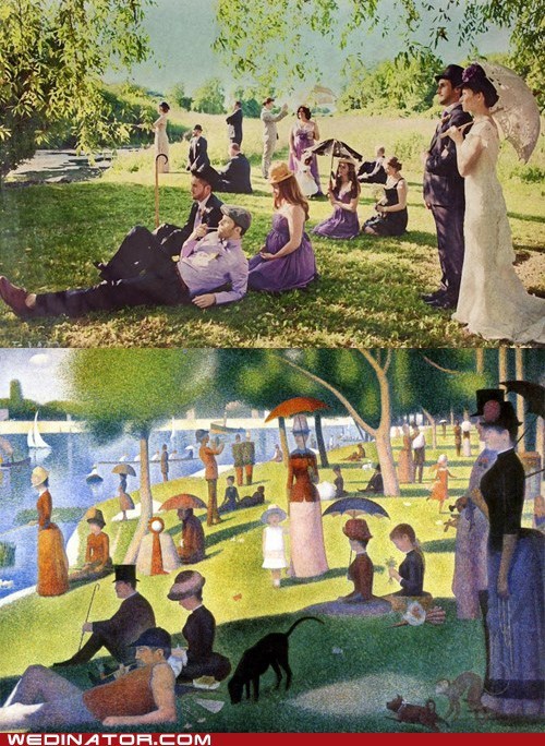 "Sunday Afternoon on the Island of La Grande Jatte" by Georges Seurat, and "Sunday Afternoon Just Kickin' It in Our Victorian Clothes" by this wedding party.