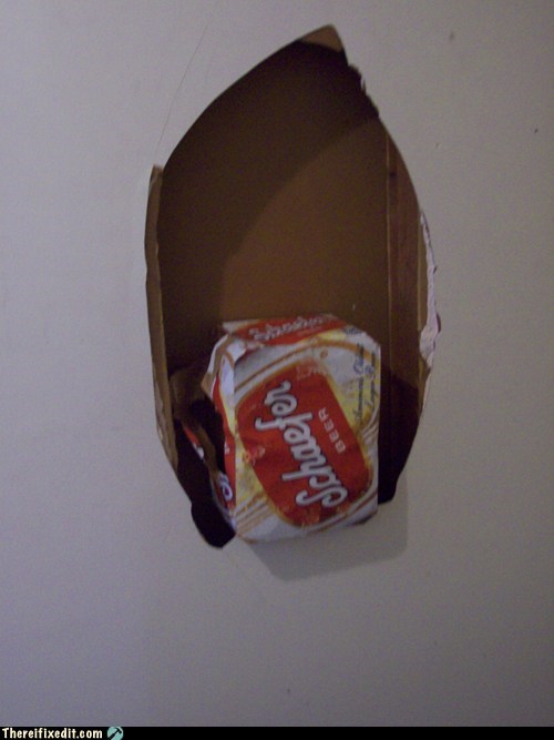 "One roomie made this hole in the wall a few months ago, and said that he'd fix it. I told him that he better not just cover it with a poster. Recently, another roomie made this fix."