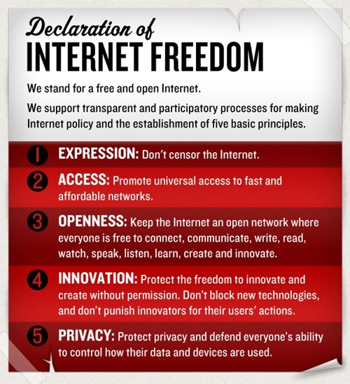 We believe that a free and open Internet can bring about a better world. To keep the Internet free and open, we call on communities, industries, and countries to recognize these principles. We believe that they will help to bring about more creativity, more innovation, and more open societies.