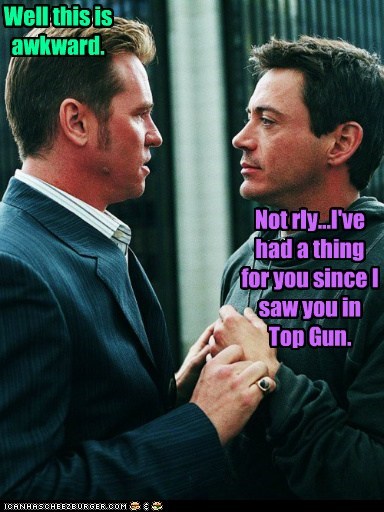 Well this is awkward. Not really... I've had a thing for you since I saw you in "Top Gun." -Val Kilmer, Robert Downey, Jr.