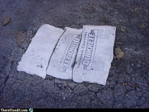 Instead of actually filling the potholes, just throw a bag of powdered concrete in there! Genius!